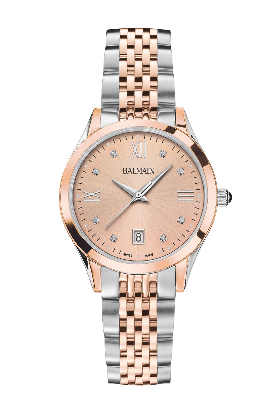 De Balmain Classic R is een elegant dameshorloge dat stralende verfijning combineert met een modern design geïnspireerd op de Parijse haute couture. De roségouden wijzerplaat, bezet met 8 Top Wesselton VS-SI diamanten met een totaalgewicht van 0,030 karaat en klassieke Romeinse cijfers, zorgt voor een zachte, verfijnde touch. De 34 mm tweekleurige kast van roestvrij staal en roségouden PVD met een slank profiel van 6,80 mm en bijpassende band biedt dagelijkse verfijning. Dit Swiss Made horloge is voorzien van saffierkristalglas.