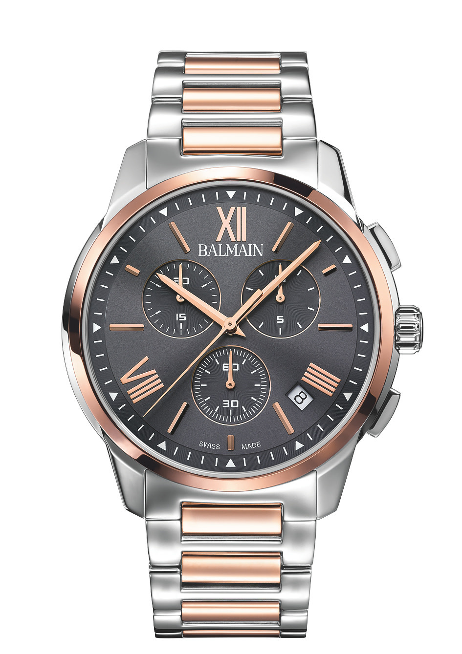 Een sportchronograaf voor heren is zojuist toegevoegd aan de Madrigal-collectie van Balmain. Met zijn eigentijdse design en gedurfde lijnen is dit nieuwe model verkrijgbaar in verschillende wijzerplaatkleuren en met een stalen of leren band. De details van de wijzerplaat benadrukken de persoonlijkheid en atletische identiteit, maar behouden tegelijkertijd een gestroomlijnde look. De nieuwe, heerlijk eenvoudige Madrigal Chrono Gent zal zijn plaats vinden aan de pols van atleten die geen concessies doen aan stijl: mannen die zich evengoed op het veld als op de meest chique feesten op hun gemak voelen. Met dit resoluut eigentijdse horloge presenteert Balmain een ontwerp met strakke, mannelijke lijnen dat toch zijn elegantie behoudt.