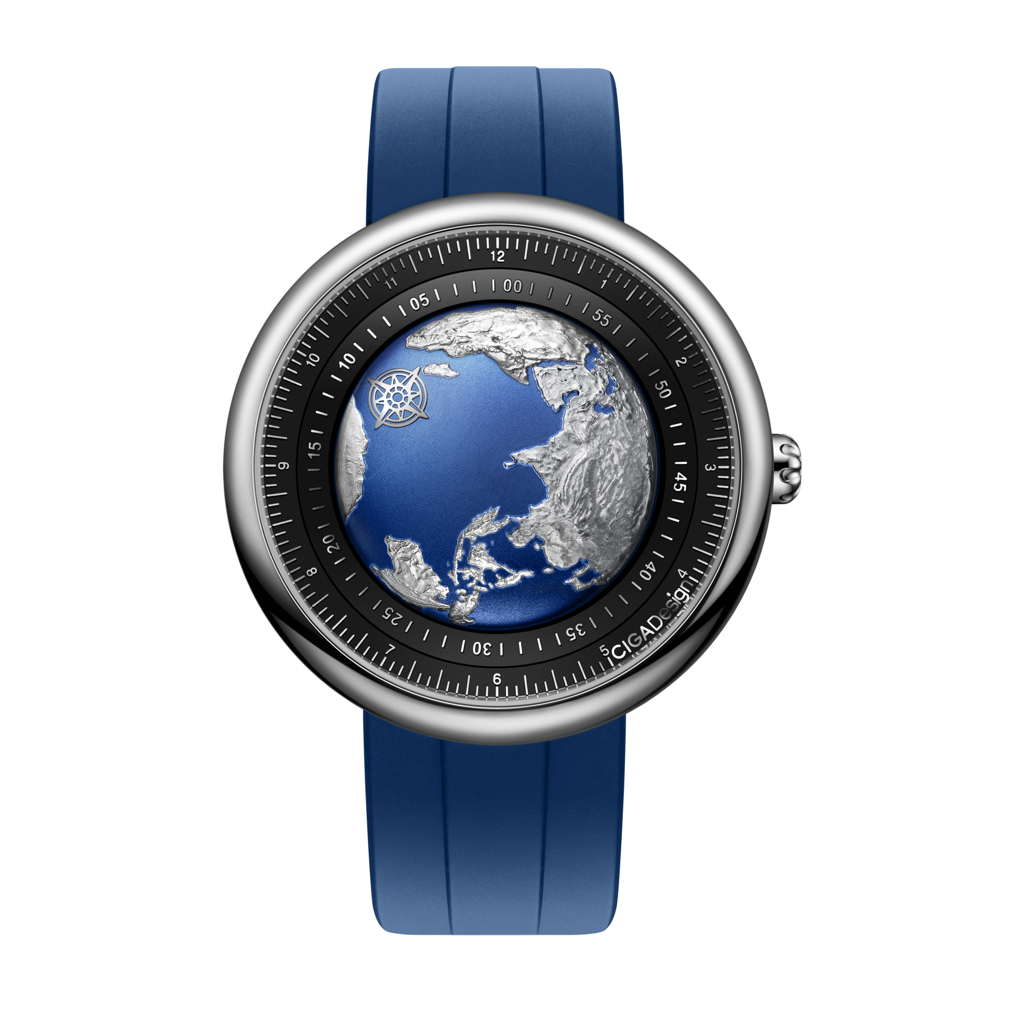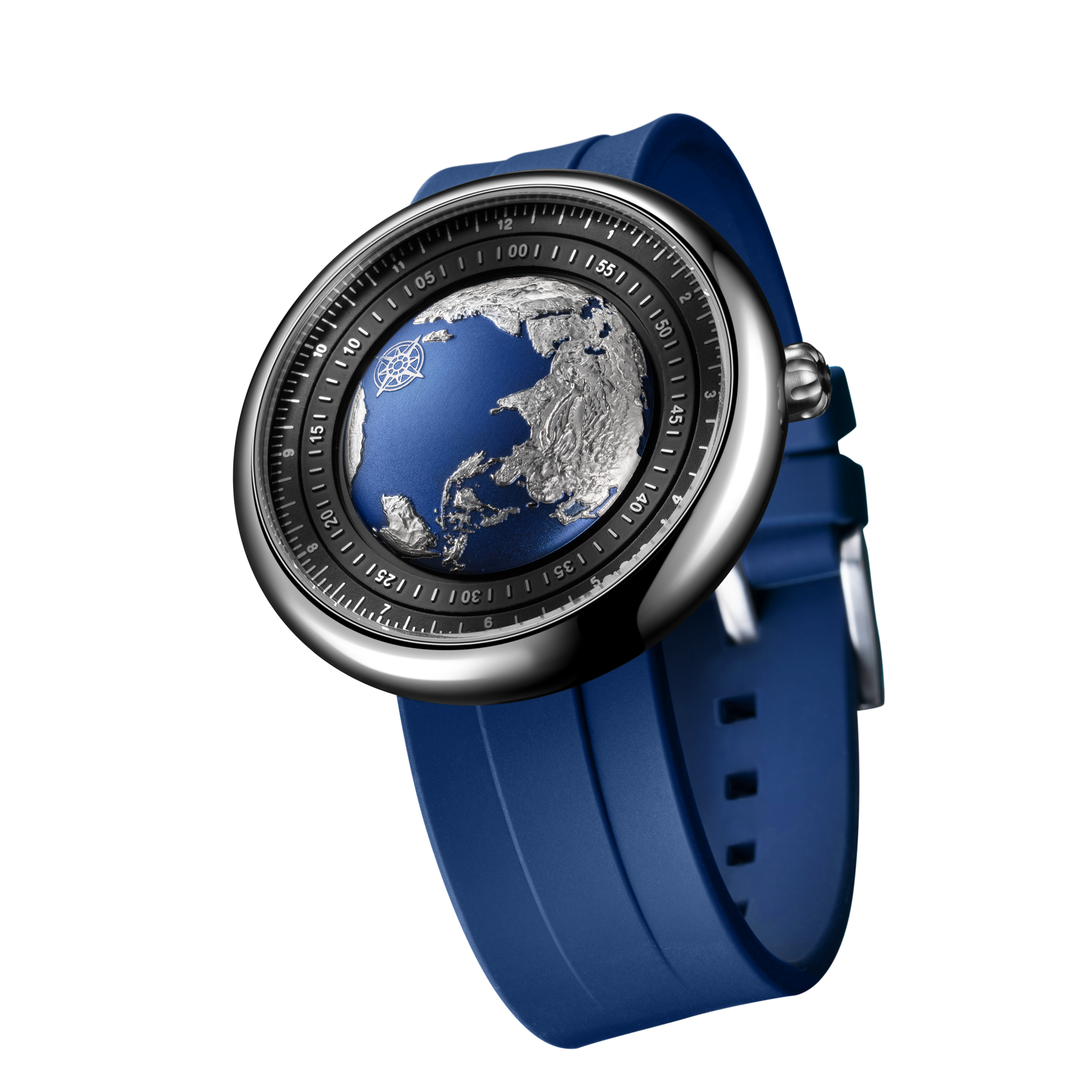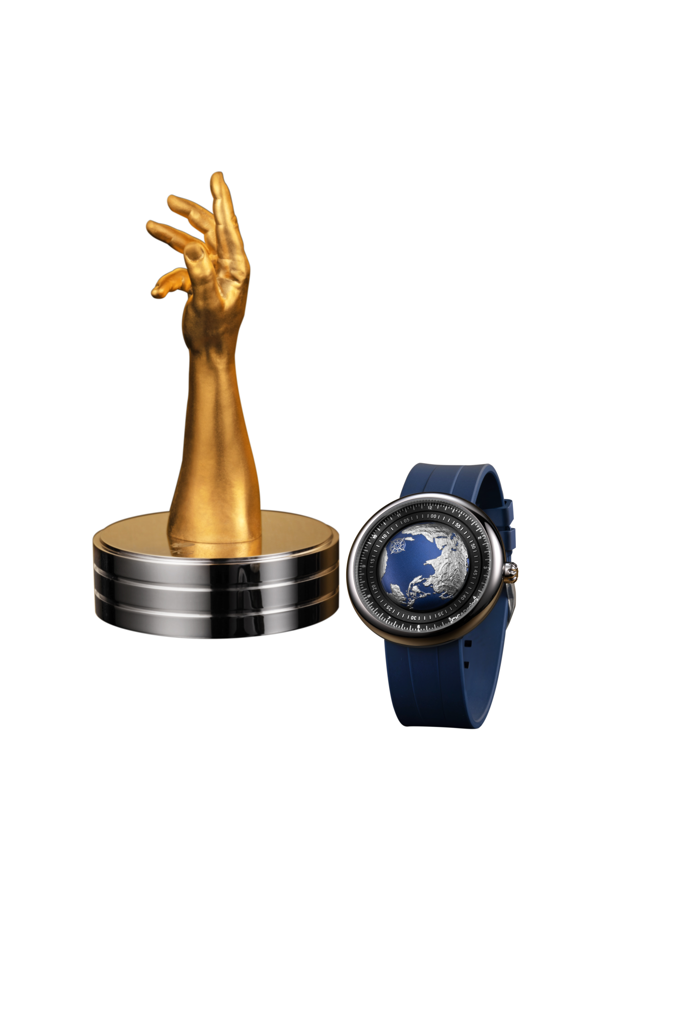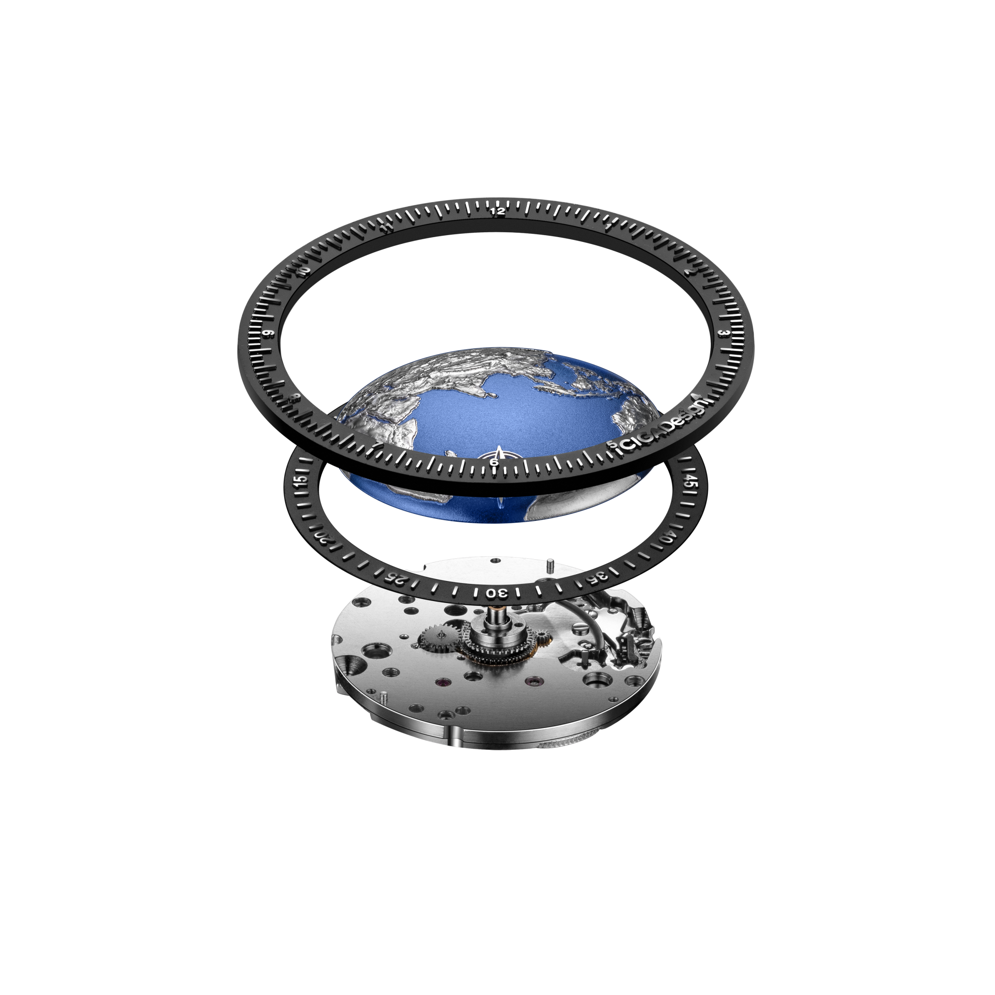 De wereldbol is de uurwijzer aan de hand van de punt van de windroos die wijst naar de twee buitenste randen...