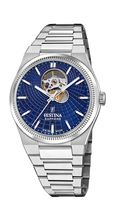 F20053/2 - Herenhorloge - Swiss Made - Stalen band - Blauwe wijzerplaat - Secondewijzer - Saffierglas - Waterdicht 10atm - Diameter 40 mm - Zwitsers automatisch uurwerk - Open Heart - Garantie: 2 jaar