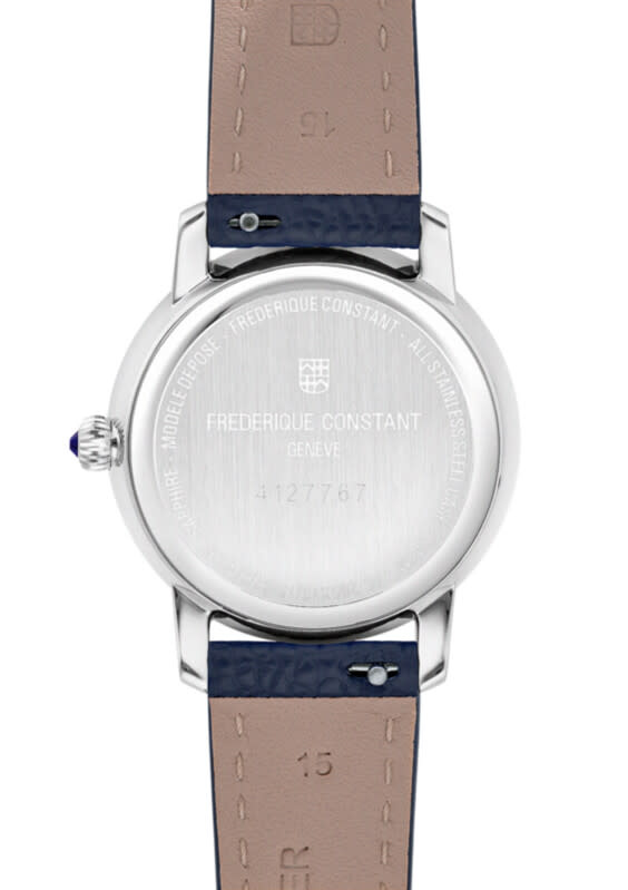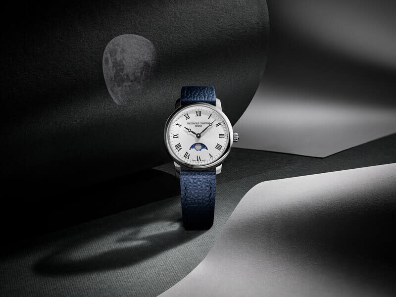 Het Classics Slimline Ladies Moonphase horloge is ontworpen om de delicate rondingen van de pols van de drager op een tedere, evenwichtige manier te benadrukken met zijn 30mm kast. Dit verfijnde model heeft een maanfase op de wijzerplaat. Deze kostbare, eigentijdse collectie belichaamt de expertise en het vakmanschap van Frederique Constant, en biedt luxe Zwitserse horloges die betaalbaar zijn en een vleugje hemelse poëzie.