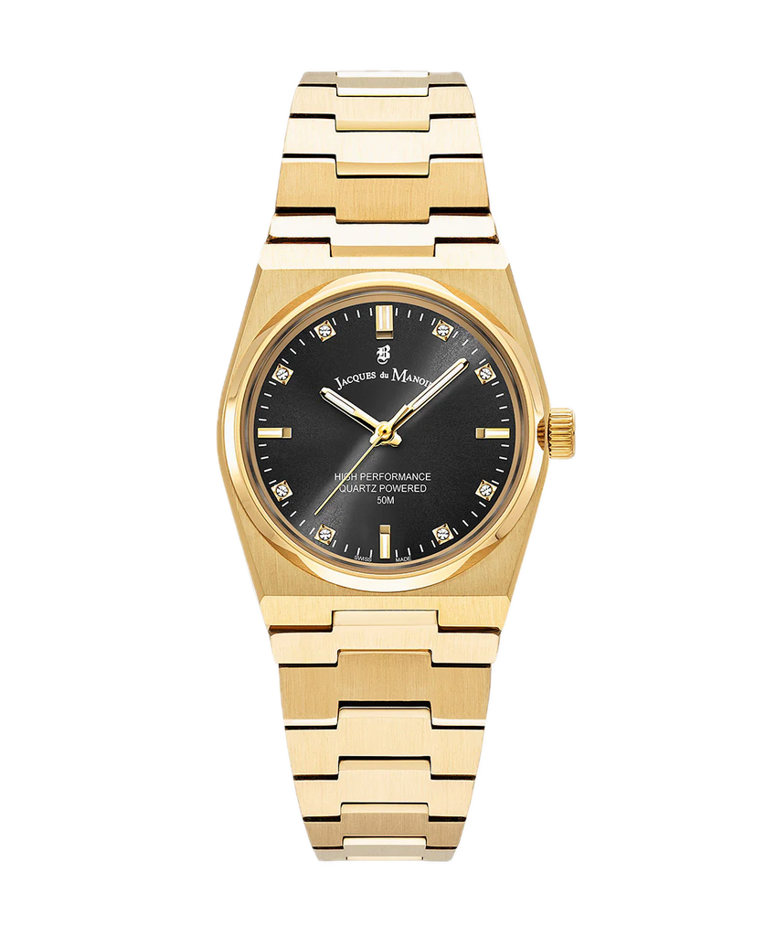 Horizon Ladies, Ø 31mm, gold case, Black Sunray dial, gold bracelet, 3 hand, Mineral glass.