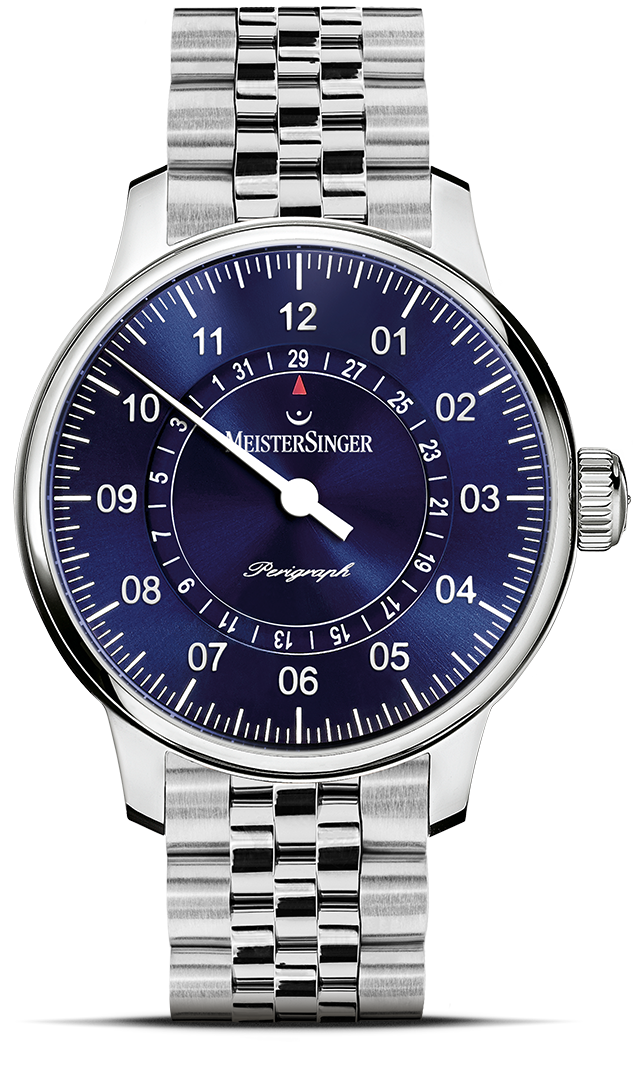 De Perigraph met nachtblauw, fijn changerend zonnestraalpatroon behoort al heel lang tot de klassiekers van MeisterSinger. De datumring is volledig opengewerkt en geeft structuur en diepte aan de wijzerplaat. De kleine rode pijl op 12 uur wijst naar de actuele datum.