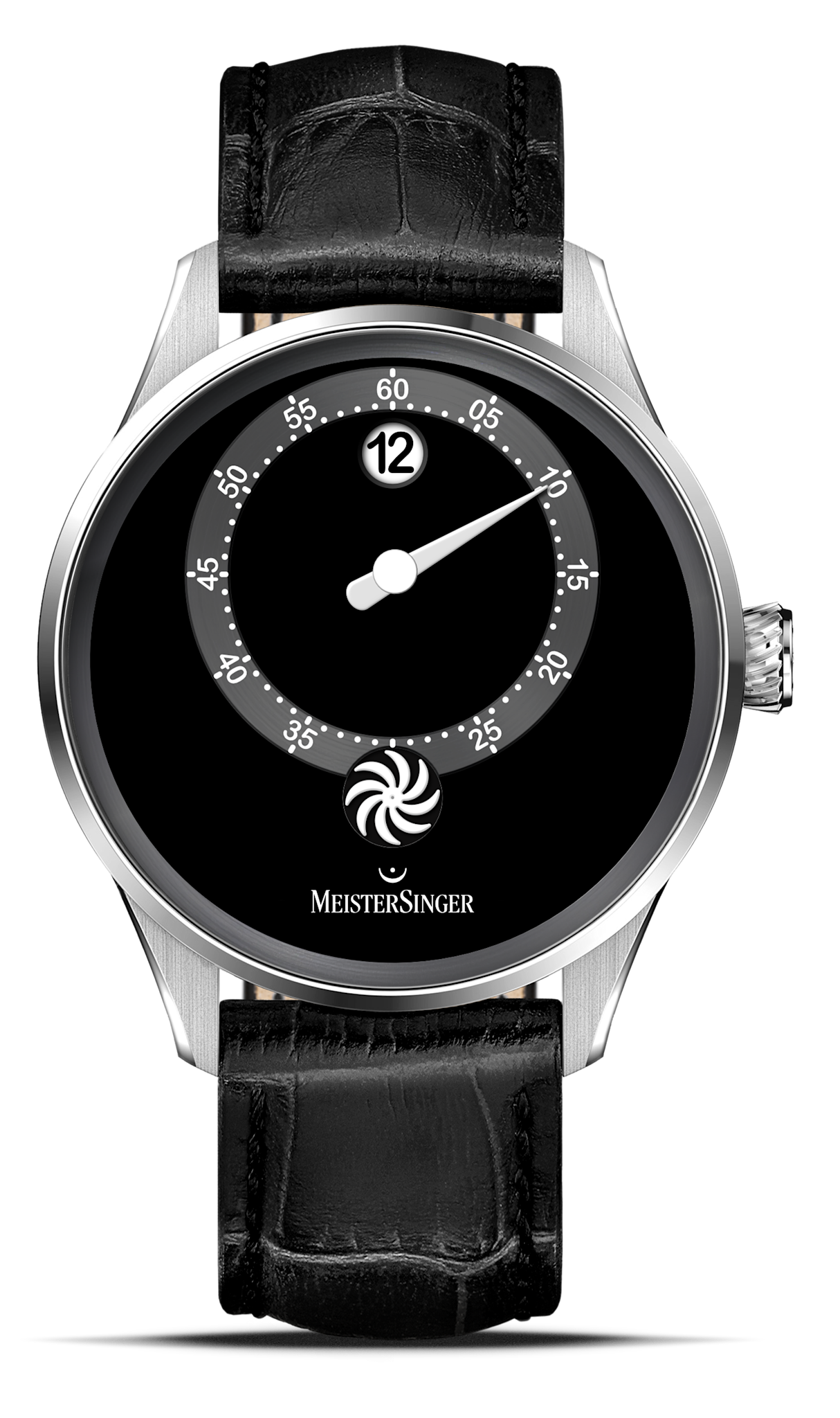 Elke streep in de buitenste cirkel van de MeisterSinger-horloges met één wijzer staat voor precies 5 minuten. De wijzer is dus zowel een uurwijzer als een minutenwijzer. Als de wijzer bijvoorbeeld naar de vijfde streep na tien wijst, is het 10:25.